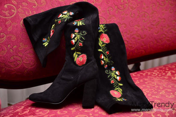 El caso es que recordé haber visto unas botas altas de tacón días atrás en la web de Exè que me habían parecido muy atrevidas, pero perfectas para este momento porque traían un bordado de flores en el lateral en las mismas tonalidades que el del top, también floral, así que, doble acierto. Además, al ser negras y de ante, el bordado destacaba un montón.