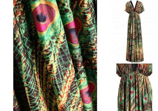 1- Empiezo seleccionando un vestido con estampando pavo real, que va desde la talla M a la 6Xl y queda genial en todo tipo de siluetas.