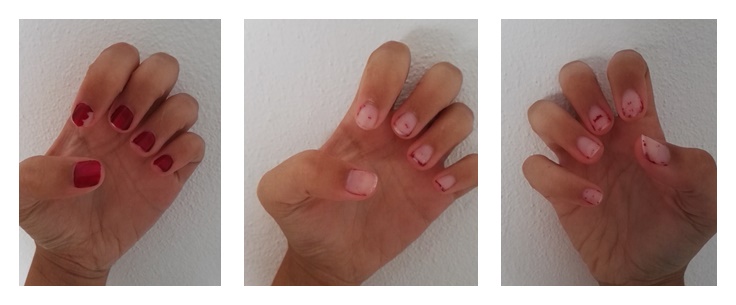 El problema y la chapuza viene ahora. No me duraron ni medio día, y encima costaba para sacarlas. Estuve estragando con el algodón y el quitaesmalte yo creo que más tiempo de lo que me duraron pintadas. Y aún así, no se salió del todo.