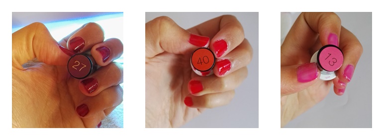 Los colores que mas me gustan es el 27 y 40, pero dejan mucho que desear. El 13 es una chapuza el color no me gusta nada y parece agua, no pinta nada (como podéis ver en las uñas se ven trozos blancos).