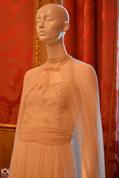 En la foto anterior, podemos apreciar un vestido largo verde de seda y pedrería. El siguiente vestido, es un vestido largo blanco de gaza, capa y cinturón.