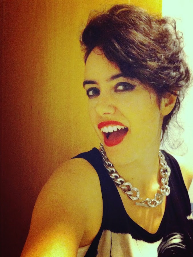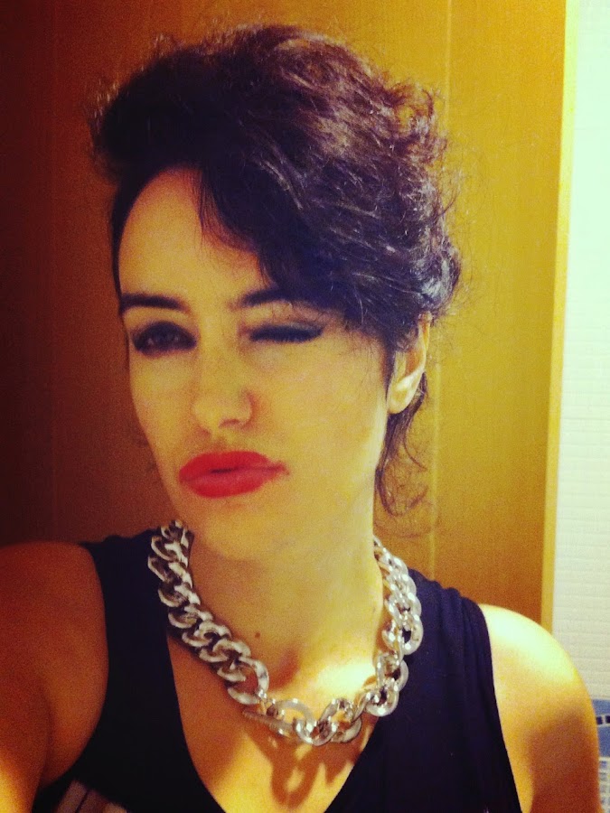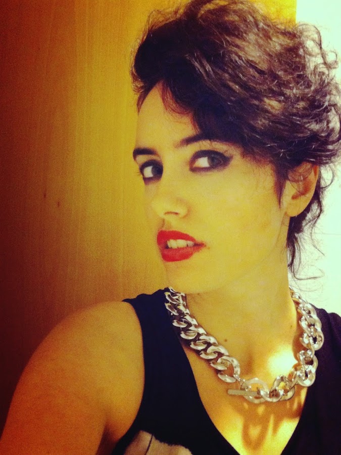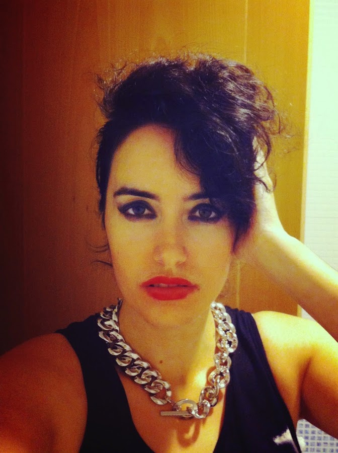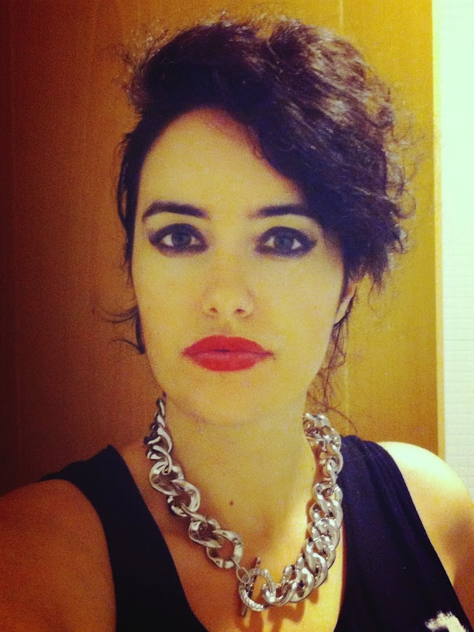 Yo conseguí el peinado de una forma muy sencilla, al tener el pelo rizado para darle mayor volumen en media mitad de la melena necesité ahuecar los rizos. Creo que me quedó a lo salvaje, jeje, pero bueno de eso se trata no? mientras que la otra mitad, realizando previamente una raya lateral, me la ajusté lo máximo posible a la nuca sujetándola con horquillas. Vamos de lo mas sencillo, calabacitas!! le añadimos un collar de eslabones, maquillaje rouge y ala, ala, a cantar y a posar a lo Rihanna, jeje!! si es que no tengo remedio!!:-).