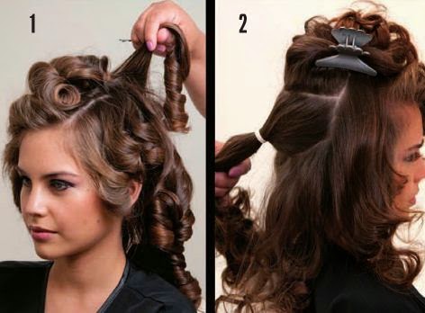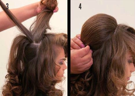 1.-2.-Usa unas tenacillas para formar ondas de mediano volumen.Luego se divide el cabello,y se forma una coleta,al centro de la parte posterior,dejando cabello suelto en la parte baja y en la parte superior.