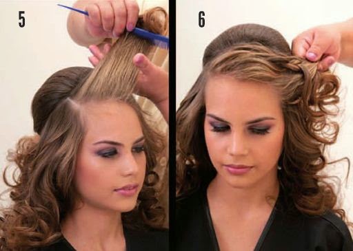 5.-6.-7.-Inmediatamente se comienza a trabajar la mayor parte frontal,realizando una trenza de 4 ,recogiendo poco a poco el cabello hasta culminar en la cola,cuidando mantener las ondas de la misma.En este paso,se aplica cera para evitar que queden pelitos sueltos.