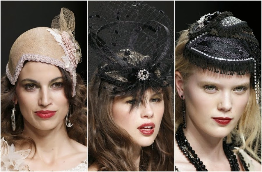 Tocados de fiesta de inspiración años 20, con forma de casquete, rejilla, flecos y pedrería. Vistos en el desfile de Matilde Cano, colección 2013.