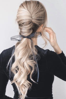 ¡Ata todo ese cabello largo en una coleta alta, como Ariana Grande!El secreto del look es un cabello súper liso. Para conseguir eso, seque su cabello, desde las raíces hasta las puntas para darle ese brillo extra. Luego, separa tu cabello horizontalmente en dos partes. Asegure la mitad superior sea alta, donde le gustaría que esté la base. Agregue la mitad inferior al resto y asegúrelo con una banda elástica, envolviendo un pedazo de cabello alrededor para mayor delicadeza.