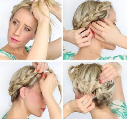 Toma una de las trenzas (en el ejemplo hemos tomado la trenza del lado derecho) y comienza a enroscarla sobre sí misma. Luego sujétala con un clip para el cabello. Acomoda la flor y disfruta de este peinado maravilloso y muy fácil.