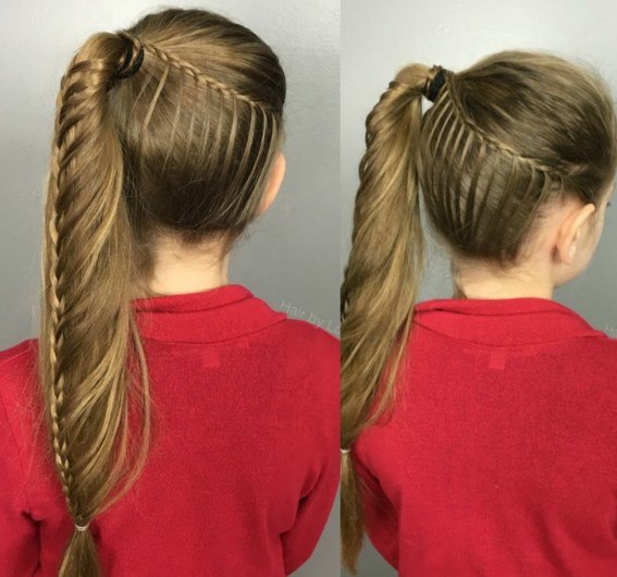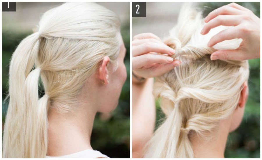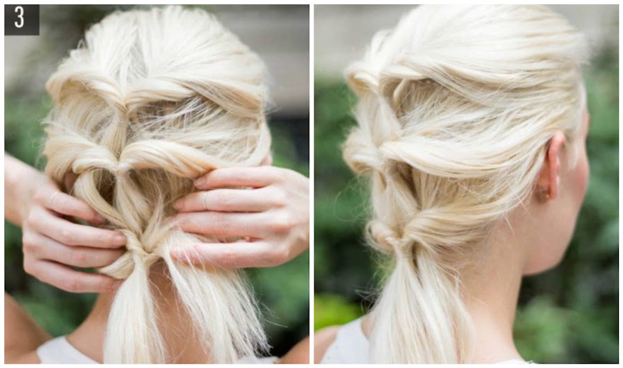 Paso n°3.- Acomoda la cola de caballo superior de manera tal que nos quede por debajo de las otras dos y así sucesivamente. Luego (y como paso opcional) pasa esta cola de caballo (la superior) por el centro de la cola de caballo que se encuentra más cerca de la nuca. De esta forma nos quedará la parte sobrante por debajo del peinado.