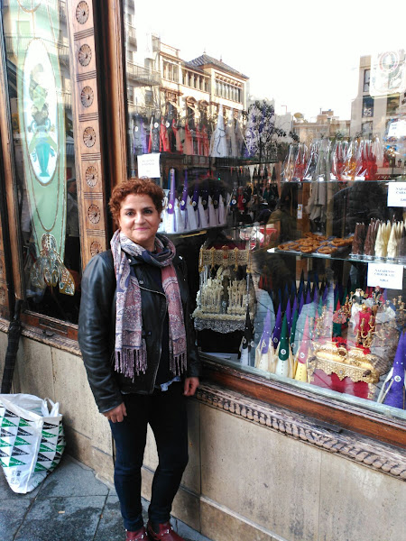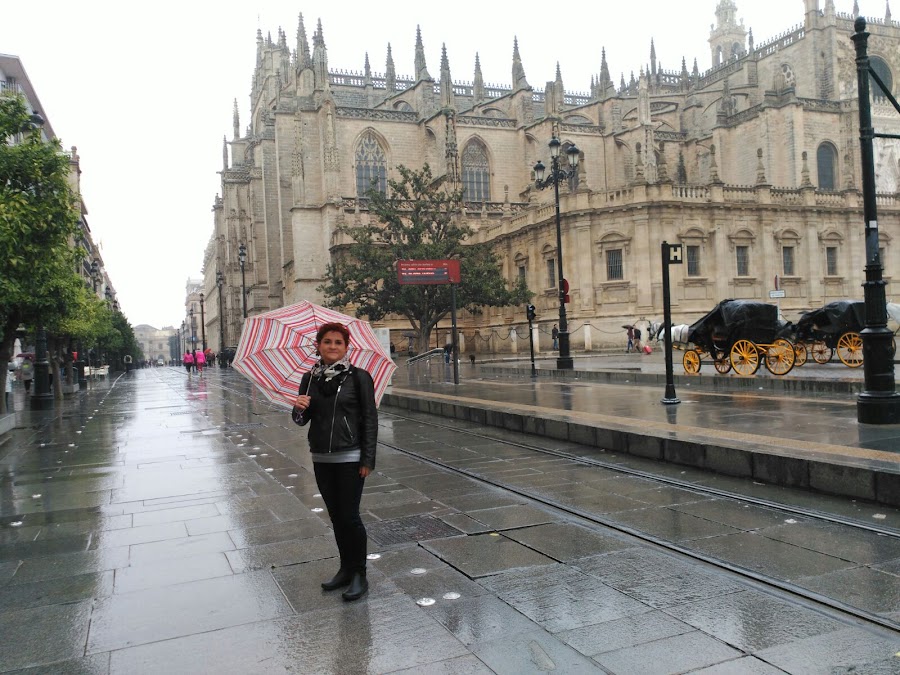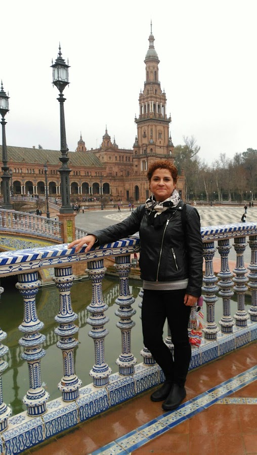 Esta CincuentaÑera, pelirroja y de pelo corto que posa frente a la Plaza de España, en Sevilla, es mi gran amiga Belén.