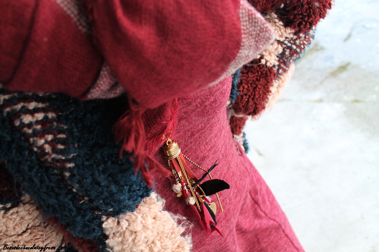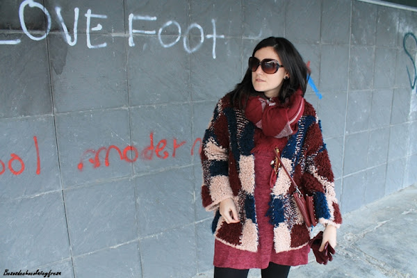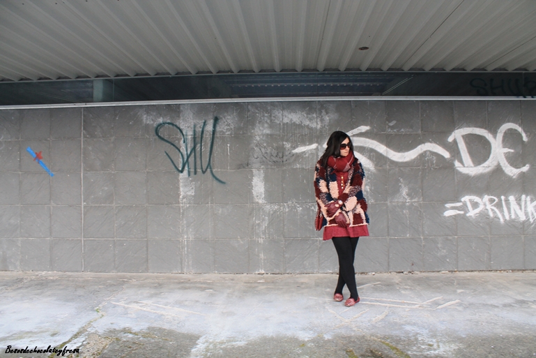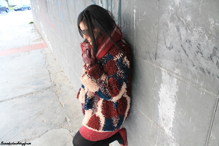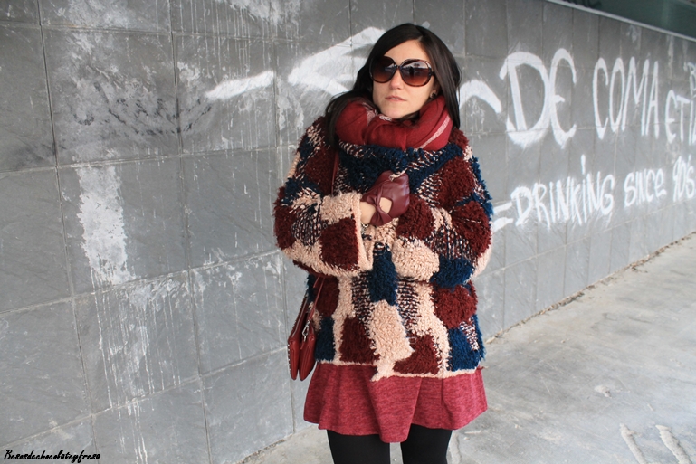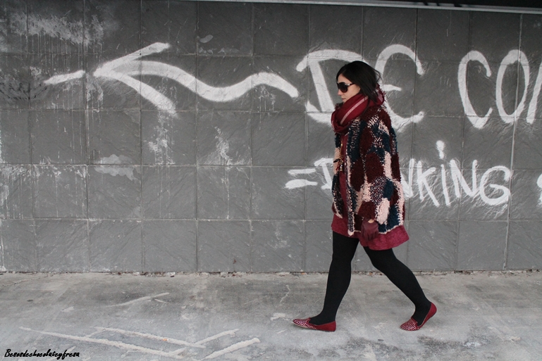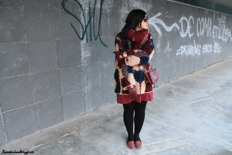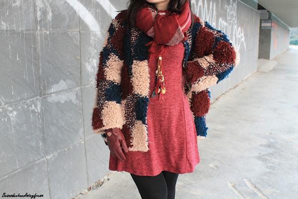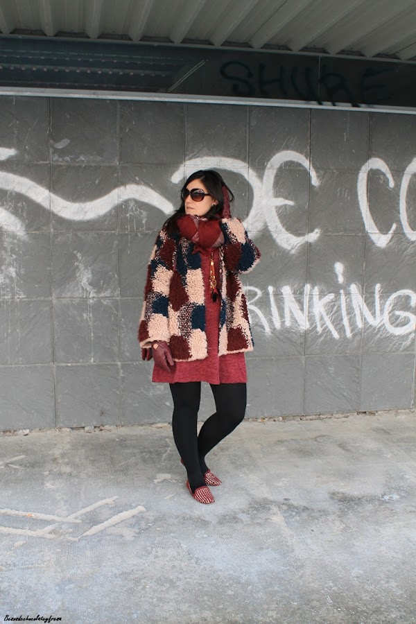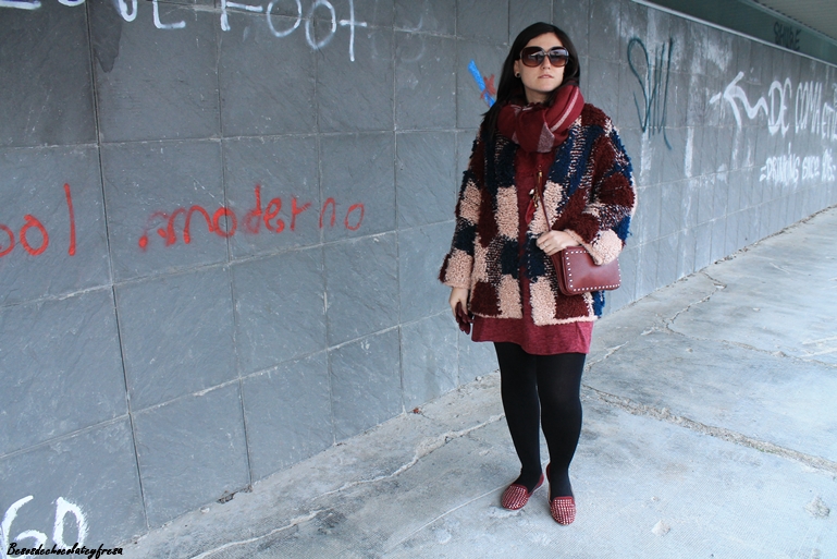 En esta ocasión llevo vestido burdeos, súper calentito que ya os enseñara AQUÍ, con abrigo furry estilo patchwork en nude, slippers de tachuelas en el mismo tono al igual que el bolso, el collar, los guantes y la bufamanta. Abrigada con glamour...jiji