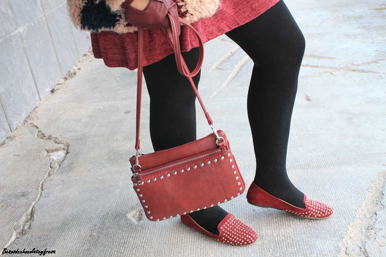 This time I wear burgundy dress, super warm already teach you here with furry coat style patchwork nude, studded slippers in the same tone as handbag, collar, gloves and bufamanta. Sheltered glamorous ... jiji