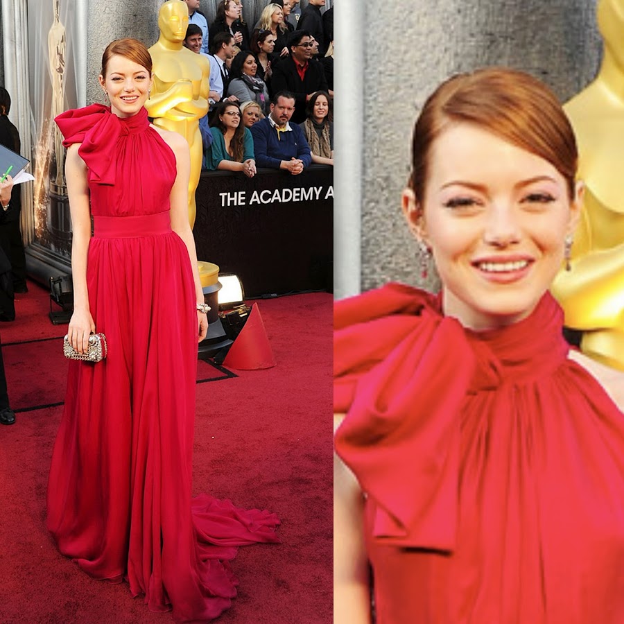 Emma Stone con su raya lateral y flequillo hacia delante con un color muy favorecedor a la cual Vistio Glambattista Valli