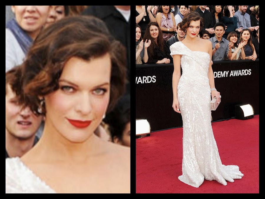 Mila Jovovich un peinado de ondas en una melena muy dulce y glamouroso luciendo un vestido asimetrico de Elie Saab