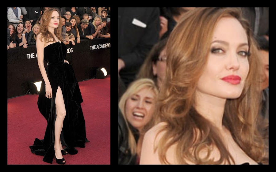 Angelina Jolie luce unas ondas en la mitad del cabello ella siempre espectacular con un Versace.