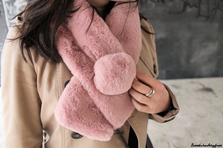 Hoy os enseño un nuevo look con una prenda estrella este invierno, las bufandas tipo estola de peluche, la mía es más tirando a bufanda con detalle de pompón para atarla, en el color que sigue esta temporada, el rosa empolvado.