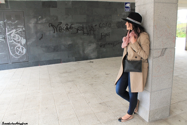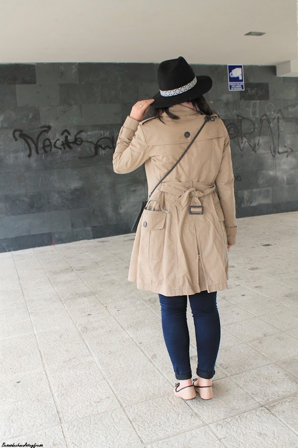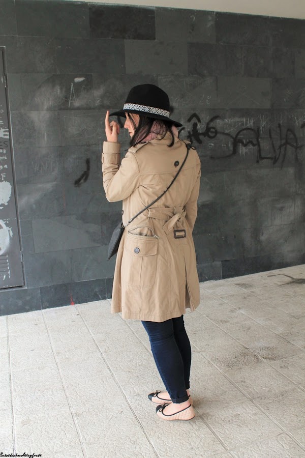 Esta vez la decidí llevar con un look básico y colores neutros como son la trench, sweater negro, jeans, bailarinas tipo Chanel, bolso bandolera y sombrero en negro. ¿Qué os parece?