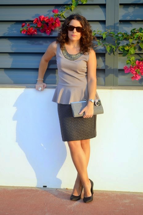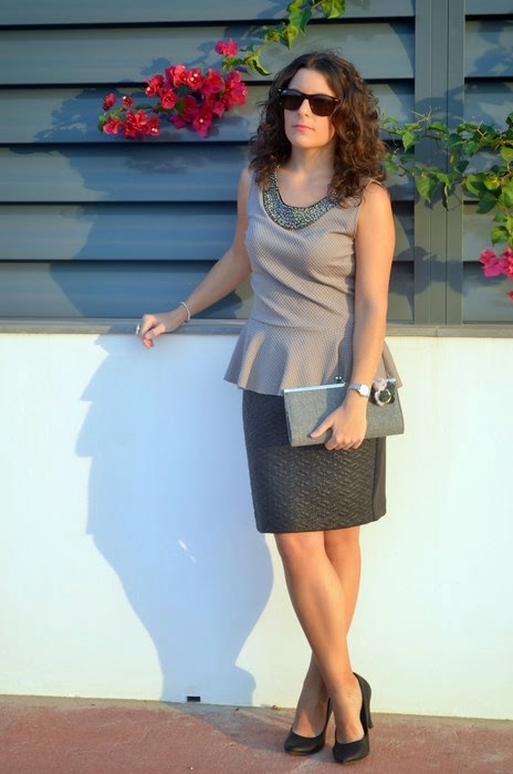 ¿Os gusta el estilo peplum? A mi me encanta, me parece un diseño muy femenino, pues realza nuestra figura ya que hace énfasis en la cintura y acentúa más las curvas de nuestro cuerpo. En este caso combino una falda de tubo negra con detalle delantero de piel con un cuerpo gris de estilo peplum con collar incrustado. Este look es perfecto para ir a la oficina, colores neutros y formales. Ahora ya debemos ir con una chaqueta porque por las mañanas refresca un poco, y lo ideal sería acompañar este outfit con una blazer negra. ¿Qué opináis de este look?