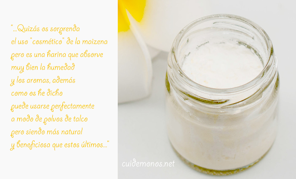 Quizás os sorprenda el uso "cosmético" de la maizena pero es una harina que absorbe muy bien la humedad y los aromas, además como os he dicho puede usarse perfectamente a modo de polvos de talco pero siendo más natural y beneficiosa que estos últimos.