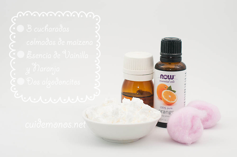 Empapamos los algodoncitos (si no tenéis podéis usar discos desmaquillantes siempre y cuando sean de algodón) con las esencias y los metemos en el tarro con la maizena. Por cierto yo he usado tres partes de esencia de vainilla por una de naranja.