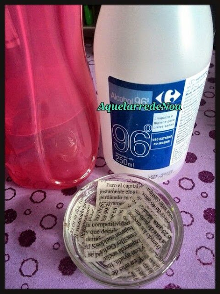 Clase básica de diluciones, cuando necesitamos A50º en el laboratorio que hacemos??? Pués si...asi a ojo en casa ya que no tenemos probetas...una parte de A96º por una parte de agua...y nuestro alcohol listo rápidamente. Un alcohol nada dañino para la piel y perfecto para lo que tenemos entre manos.