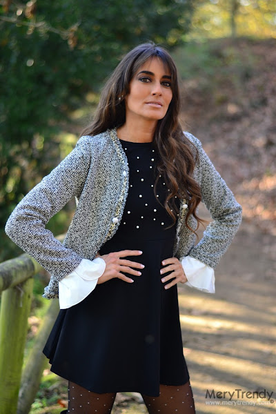 ¡Buenas, chicas! Hoy os acerco otro conjuntito muy "apañao"que me he hecho por 30 Euros, combinando 2 piezas de SheIn. En concreto, está formado una chaqueta gris de tweet (un tejido que jamás pasará de moda) con volantes, que simulan las mangas de una camisa sobresaliendo por las de la chaquetita, sobre un vestido negro de cuello redondo y manga francesa, muy básico, si no fuera por el original adorno de perlas blancas de diferentes tamaños que trae en la parte delantera. Sin duda, el detalle perfecto para darle un toque festivo a cualquier LBD de cara a cenas y compromisos navideños.