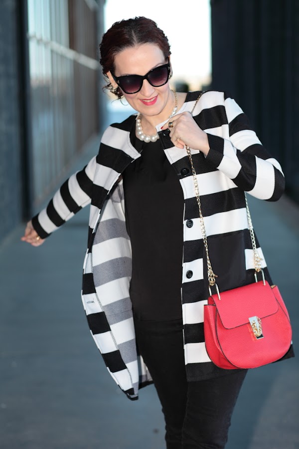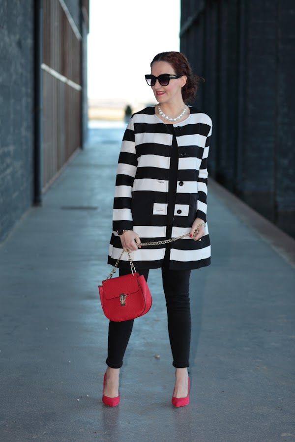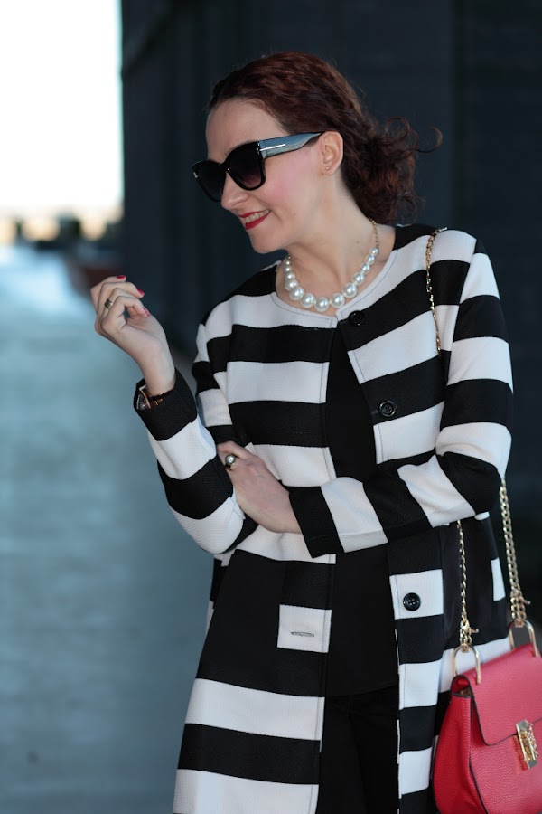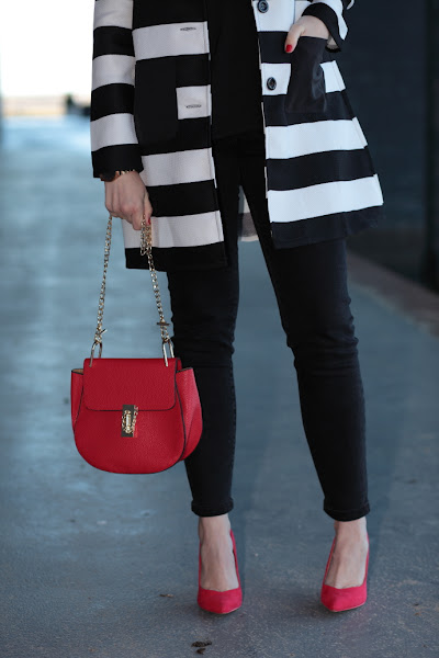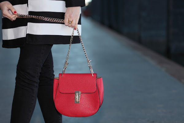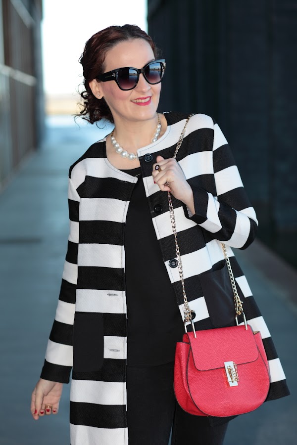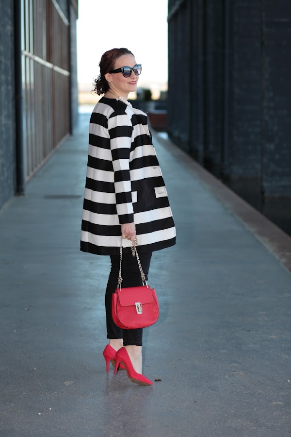 No sabéis las ganas que tenía de comprarme un abrigo de rayas en blanco y negro. Como buena aragonesa cuando algo se me pone entre ceja y ceja soy muy cabezona y no paro hasta que lo consigo. Hoy os enseño por fin el que me he comprado. Enseguida que lo vi supe que tenía que ser mío. Me gusta el corte, las rayas son del tamaño que buscaba y el detalle de los bolsillos me encanta. Además echando un vistazo al resto de la tienda me topé con este bolso rojo inspiración del Drew de Chloé que con el precio que tenía sin duda también se vino conmigo. Hoy los llevo juntos en un total look negro consiguiendo un estilismo muy chic.