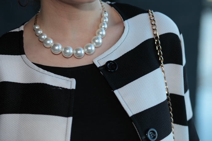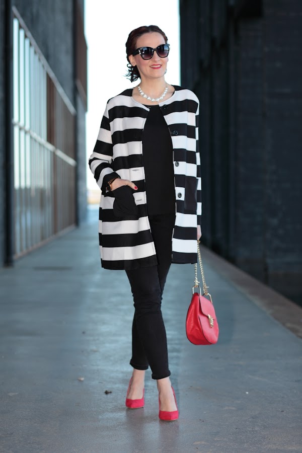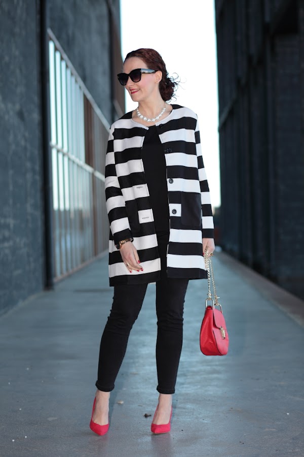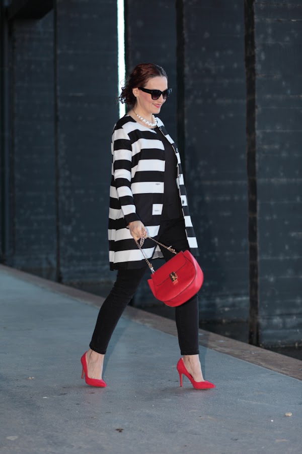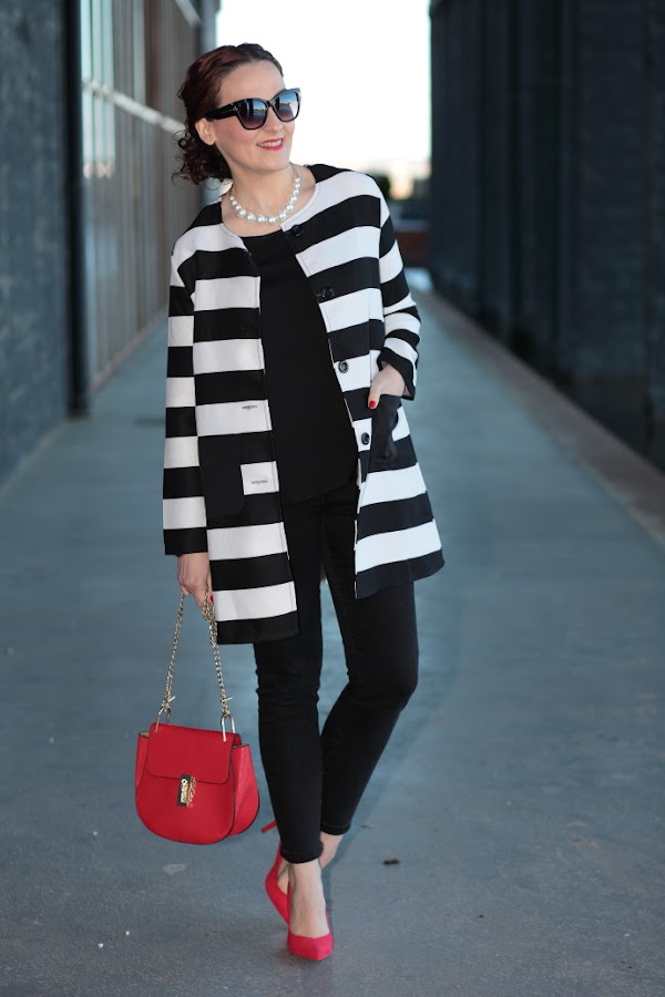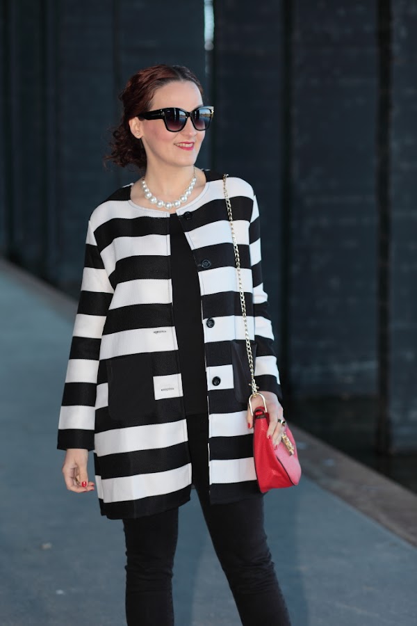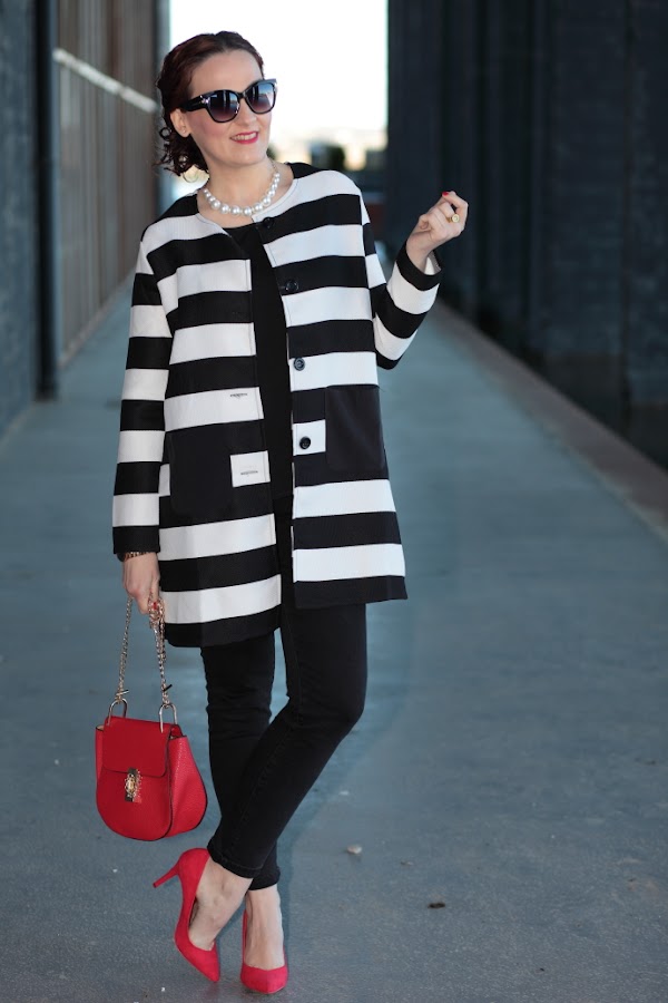 No sabéis las ganas que tenía de comprarme un abrigo de rayas en blanco y negro. Como buena aragonesa cuando algo se me pone entre ceja y ceja soy muy cabezona y no paro hasta que lo consigo. Hoy os enseño por fin el que me he comprado. Enseguida que lo vi supe que tenía que ser mío. Me gusta el corte, las rayas son del tamaño que buscaba y el detalle de los bolsillos me encanta. Además echando un vistazo al resto de la tienda me topé con este bolso rojo inspiración del Drew de Chloé que con el precio que tenía sin duda también se vino conmigo. Hoy los llevo juntos en un total look negro consiguiendo un estilismo muy chic.