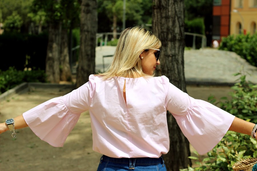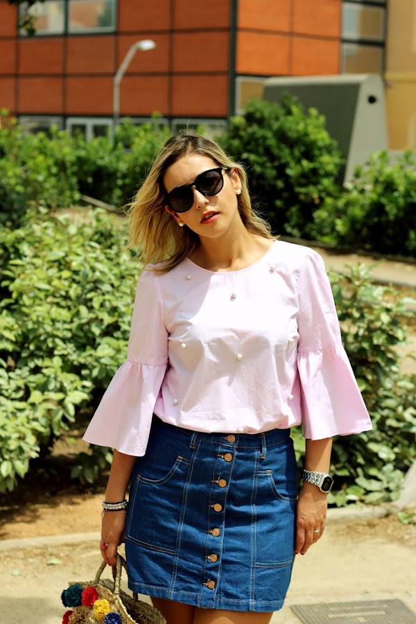 En el look de hoy os enseño mi nueva blusita rosa con perlas y mangas campana que combiné con una falda tejana de línea A. Los accesorios del look fueron mis Adidas Gazelle en rosa y mi capazo con pompones. Un look cómodo y muy dulce y femenino que me parece perfecto para el fin de semana.