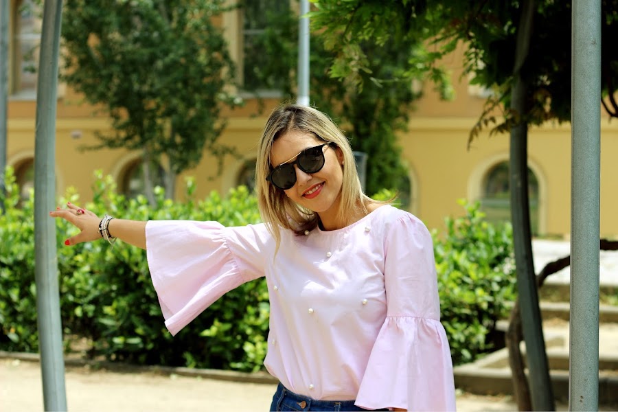 In the outfit of the day, I show you my new pink blouse with pearls and bell sleeves that I wear it with a denim skirt. The accessories of the outfit were my pink Adidas Gazelle and my bag with pompons. A comfy and sweet outfit that its perfect for wearing during the weekend.