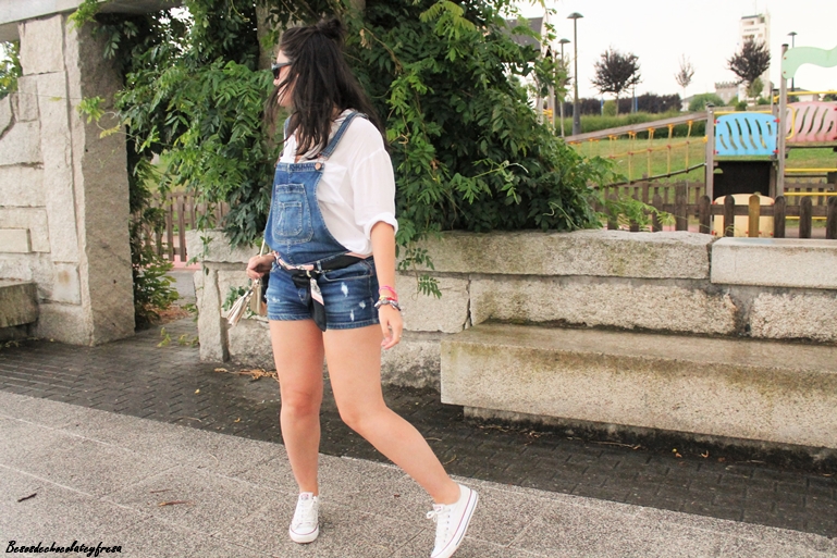 En esta ocasión llevo peto denim con camisa blanca de manga larga pero remangada y abierta. Como complementos converse en blanco junto con el bolso dorado, pañuelo a modo de cinturón (tendencia que rescaté de hace años) y la nueva tendencia en peinados, querido u odiado half bun. ¿Qué os parece?