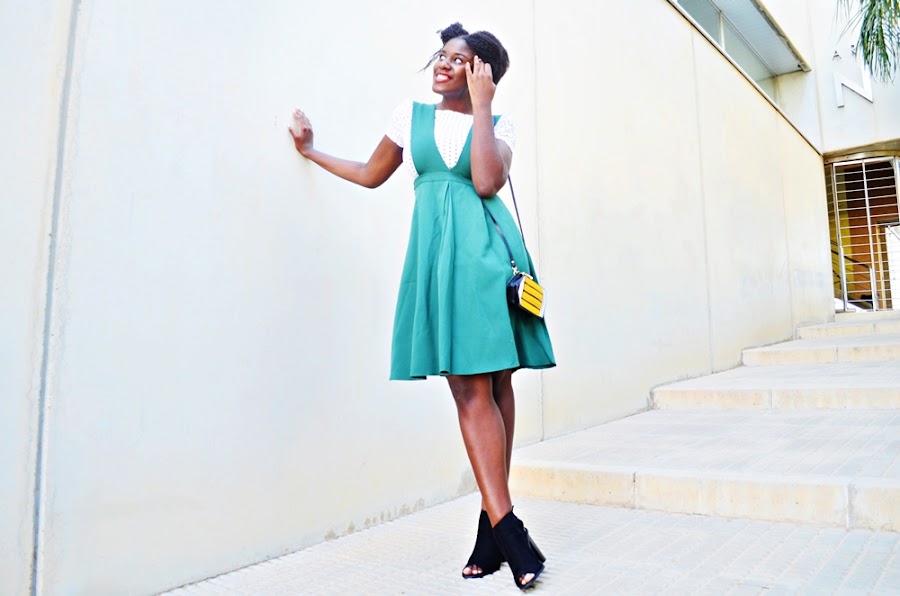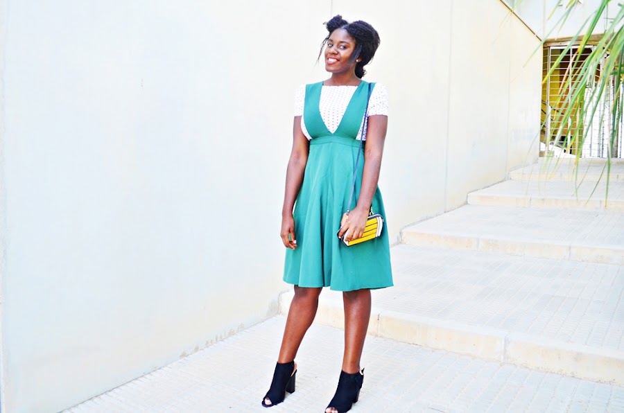 Pero como siempre mis outfits llenos de color por alguna parte, esta vez combiné mi dickey skirt ( peto falda) con una camiseta básica de puntos de hace muchos años, mi maravilloso bolso lápiz y mis nuevos zapatos que compré en Reino Unido.