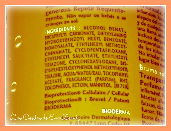 Lo primero que destaco de ésta bruma solar es su olor, no es el olor típico de producto solar, sino que tiene el olor característico de los productos de BIODERMA, un olor suave, floral, fresco, me encanta!!!, sabéis que el tema de los olores me pierde y es super agradable utilizarla con esta fragancia.