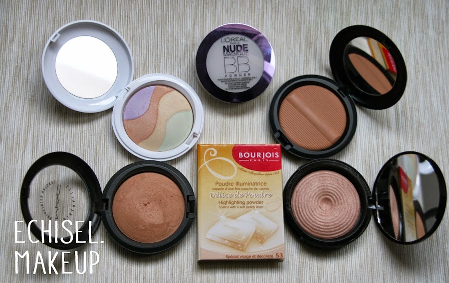 Ahora vamos con los polvos. Aquí también voy hacer dos distinciones. Para chicas que busquéis un acabado más mate y que controlen los brillos tenemos diferentes opciones. Como opción low cost me gustan los Colour Correction Power de Kiko o los Nude Magique BB Powder de L"oreal. También están genial los Studio Sculpt o los Mineralize Skinfinish Natural de Mac. Si por el contrario somos de gustos más satinados, me gustan los Radiant Light de Makeup Revolution en el tono Breathe que son muy baratitos y me encanta el acabado que dejan. Tambien tenemos los Highlighting Power de Bourjois, o los Beauty Power de Mac. Mineralize Skinfinish Natural Mac, Colour Correction Power Kiko, Nude Magique BB Powder L"oreal, Studio Sculpt Mac, Radiant Light Makeup Revolution tono Breathe, Highlighting Power Bourjois