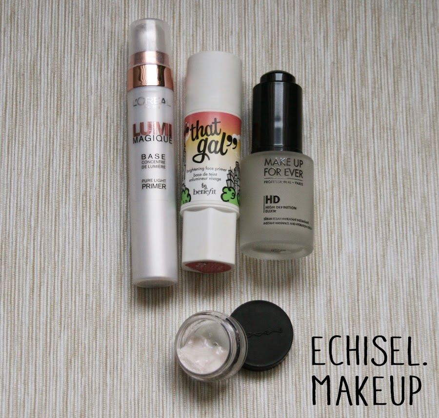Para este tipo de pieles comenzaríamos aplicando un primer, este puede ser iluminador o hidratante. Como primer hidratante a mí me gusta mucho el HD High Definition Elixir de Make Up Forever para hidratar la piel antes de la base de maquillaje. Y como prebase iluminadora me encanta el acabado que deja en la piel la Lumi Magique de L?oreal o la Cream Strove de Mac, las dos son similares y dejan en la piel un acabado nacarado. De éste mismo tipo está el That Gal de Benefit pero con un acabado rosado. Lumi Magique L?oreal, That Gal Benefit, HD High Definition Elixir Make Up Forever, Cream Strove Mac