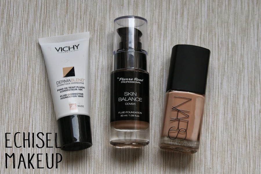 Después si aún seguimos teniendo necesidad de tapar alguna imperfección podemos aplicar una capa fina de una base de maquillaje que sea cubriente. Un buen ejemplo low cost es la base Skin Balance de Pierre René la cual comparan con la Fix Fluid de Mac, por su acabado, cobertura y larga duración. Otra es la Dermablend de Vichy que es más cara pero que deja un bonito acabado en la piel. Y de gama más alta tenemos la Sheer Glow de Nars. Dermablend Vichy, Skin Balance Pierre René, Sheer Glow Nars