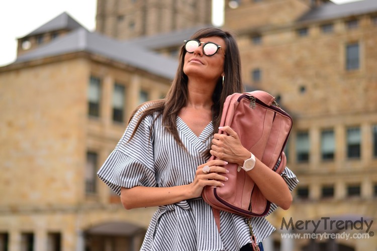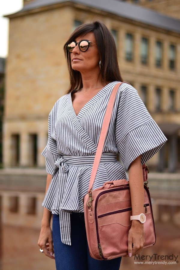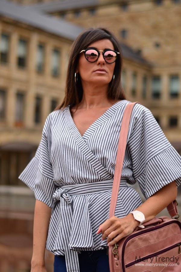 Para conjuntarlo, me he inspirado en un look cosmopolita que bien podríamos ver en las calles de Londres, ideal para una mujer sencilla y dinámica como yo, así que, nada mejor que una blusa de rayas bicolor con la siempre perfecta combinación de las eternas rayas en blanco y negro y un diseño tan envolvente como es el del escote cruzado para anudar en la cintura, que tanto se llevan esta temporada (La mía en particular es de Romwe y está genial de precio).