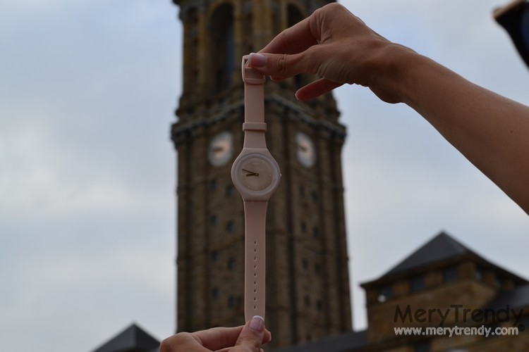 El mío en concreto es en un delicado nude o, lo que es lo mismo, en rosa empolvado, tan de tendencia este año. La esfera satinada, también en rosa, incluye relucientes puntos perforados de color dorado y líneas horizontales grabadas. La caja de doble inyección de 40.0 mm se divide en dos partes mediante una línea curva que separa la parte delantera rosa mate y un reverso de plástico blanco mate. La correa de silicona mate, la trabilla de silicona y la hebilla de plástico mate de color rosa completan el diseño más delgado de Swatch. Sin duda, un reloj ultraplano (aunque no falto de estilo), apto para las amantes del diseño minimalista que huyen de relojes pesados.
