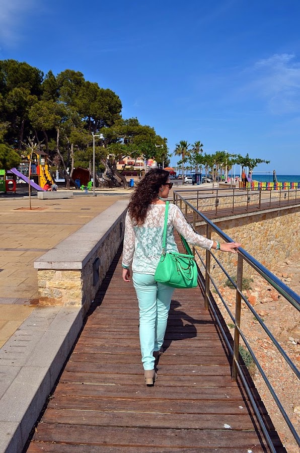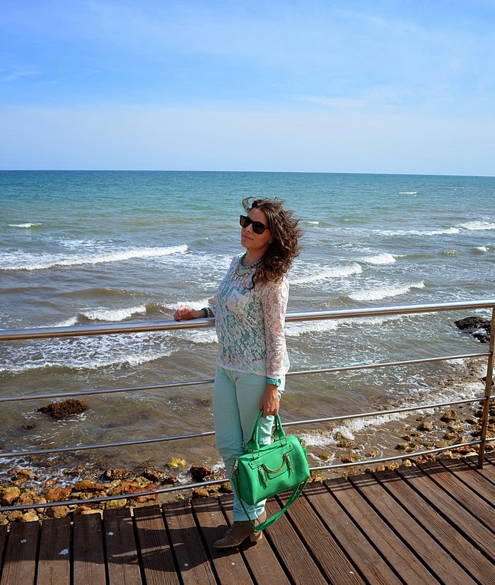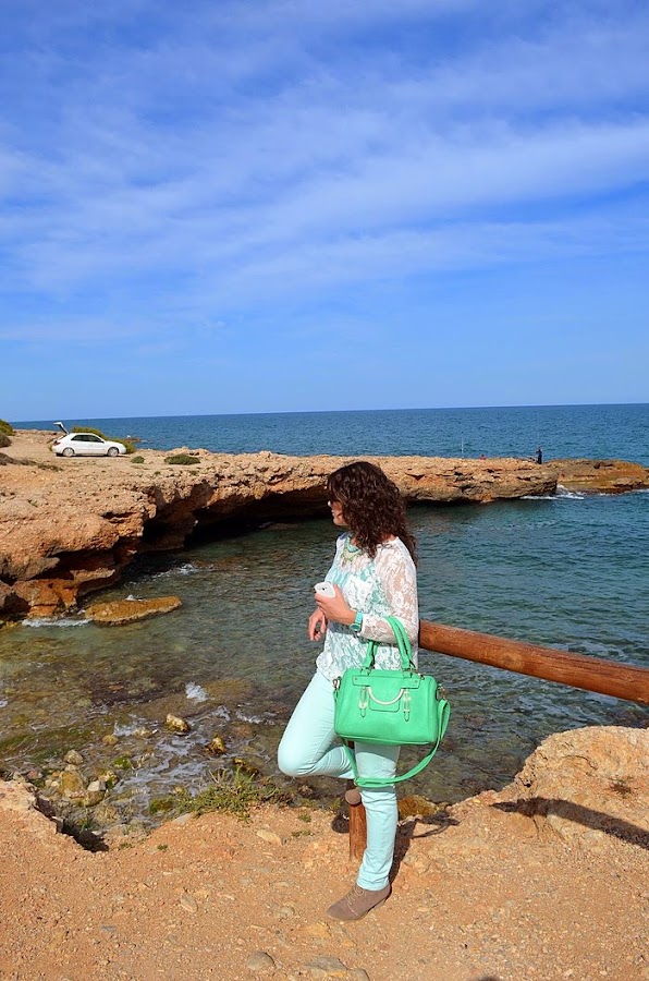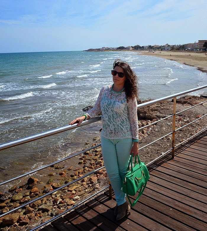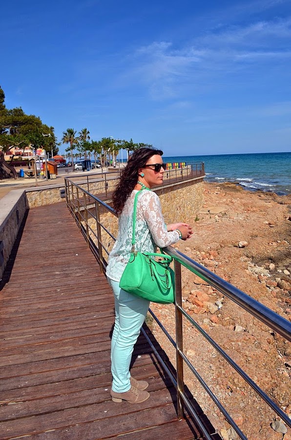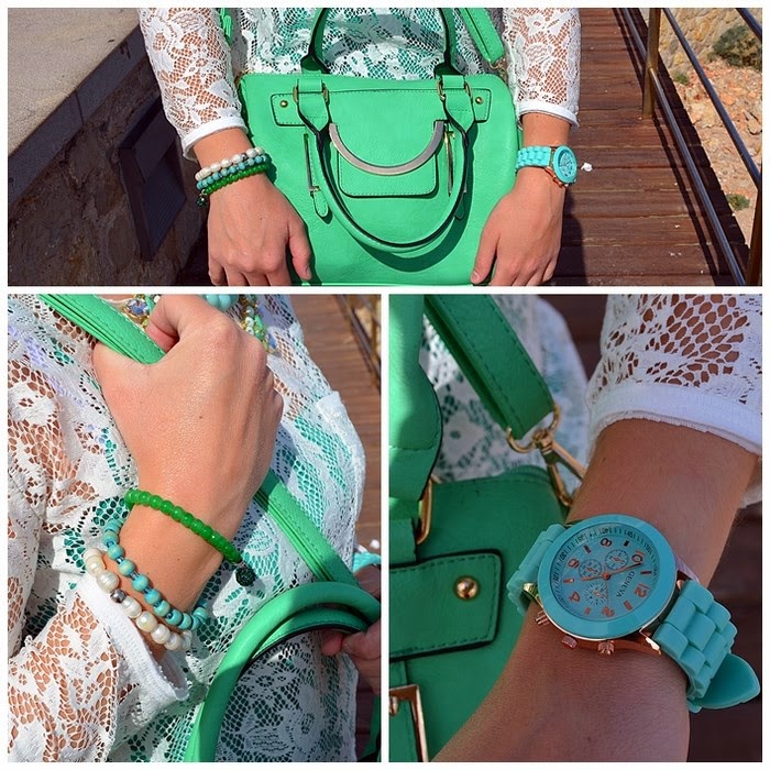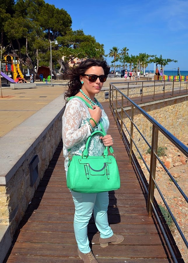 Respeto al look que llevé, sin duda busqué la comodidad pero con un toque chic. Fue sin duda un look muy primaveral y en verde. Elegí unos pantalones en tono verde pastel y una camisa de encaje en color crudo. Debajo de la camisa de encaje opté por una básica de tirantes en color verde, no sé vosotras, pero yo le saco mucho partido a estas camisetas, ya que le cambio la camisa que me pongo debajo y ya parece otra cosa. Respeto a los complementos os voy a contar un secreto jeje. El bolso de color manzana fue un chollo, me costó 10 euros en una parada del mercadillo de restos de tienda. Es una preciosidad ¿no creéis?. El collar de cuentas con flores de piedras tipo cristal y el reloj agua marina son de Trendy Accessories.
