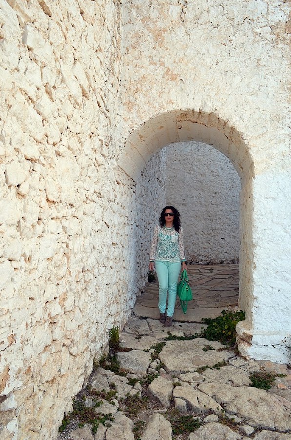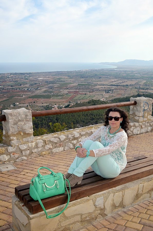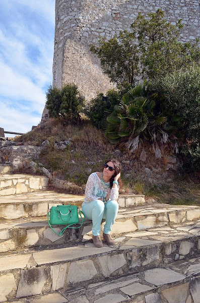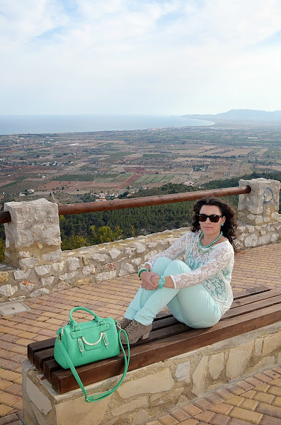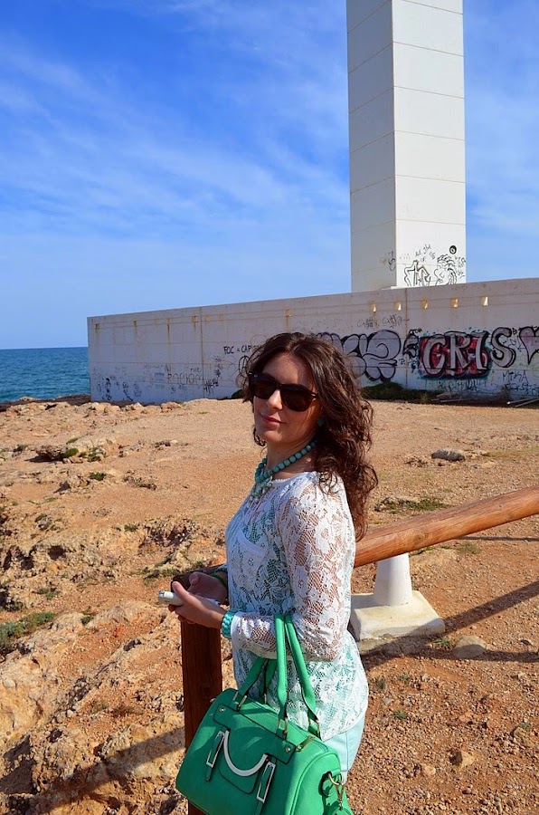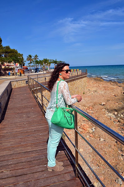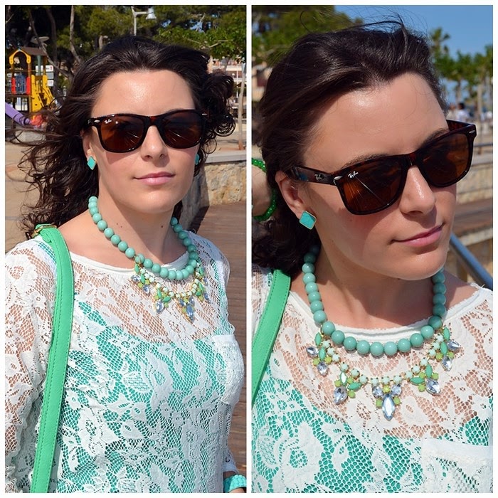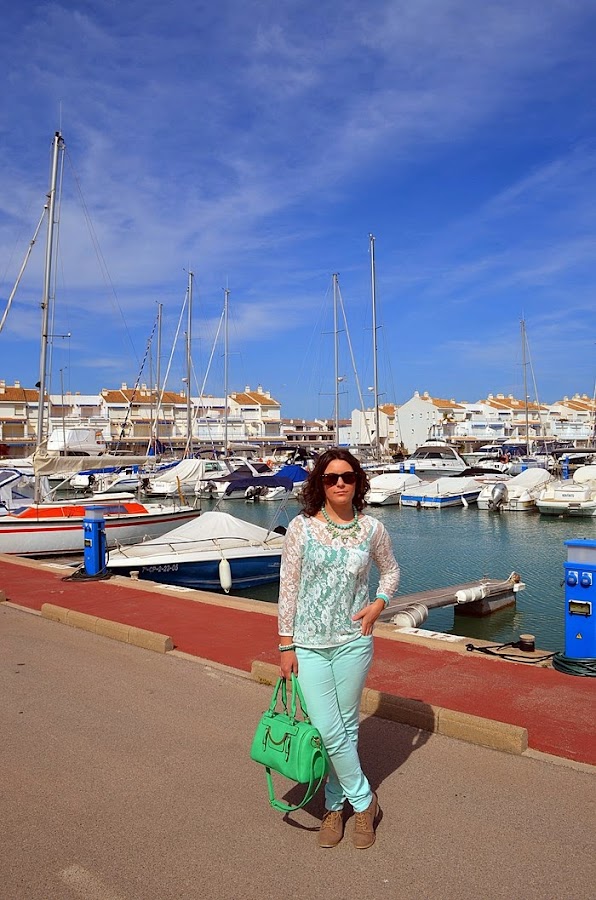 Respeto al look que llevé, sin duda busqué la comodidad pero con un toque chic. Fue sin duda un look muy primaveral y en verde. Elegí unos pantalones en tono verde pastel y una camisa de encaje en color crudo. Debajo de la camisa de encaje opté por una básica de tirantes en color verde, no sé vosotras, pero yo le saco mucho partido a estas camisetas, ya que le cambio la camisa que me pongo debajo y ya parece otra cosa. Respeto a los complementos os voy a contar un secreto jeje. El bolso de color manzana fue un chollo, me costó 10 euros en una parada del mercadillo de restos de tienda. Es una preciosidad ¿no creéis?. El collar de cuentas con flores de piedras tipo cristal y el reloj agua marina son de Trendy Accessories.