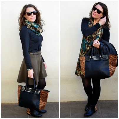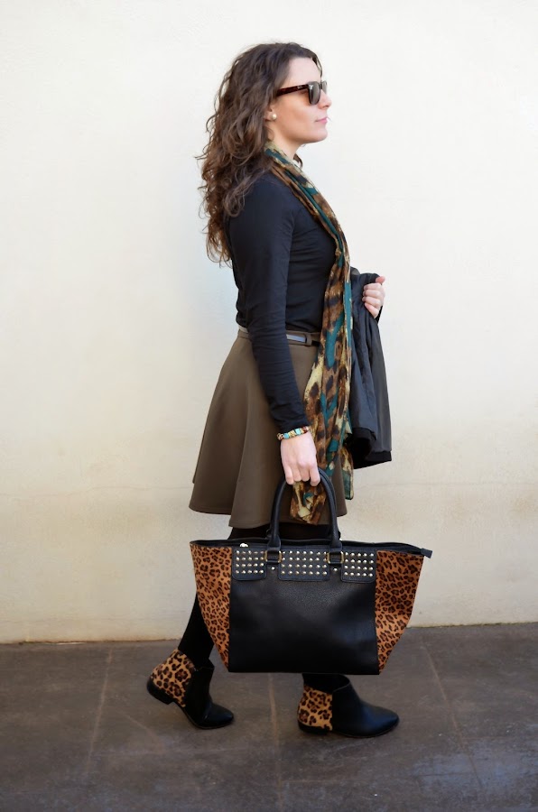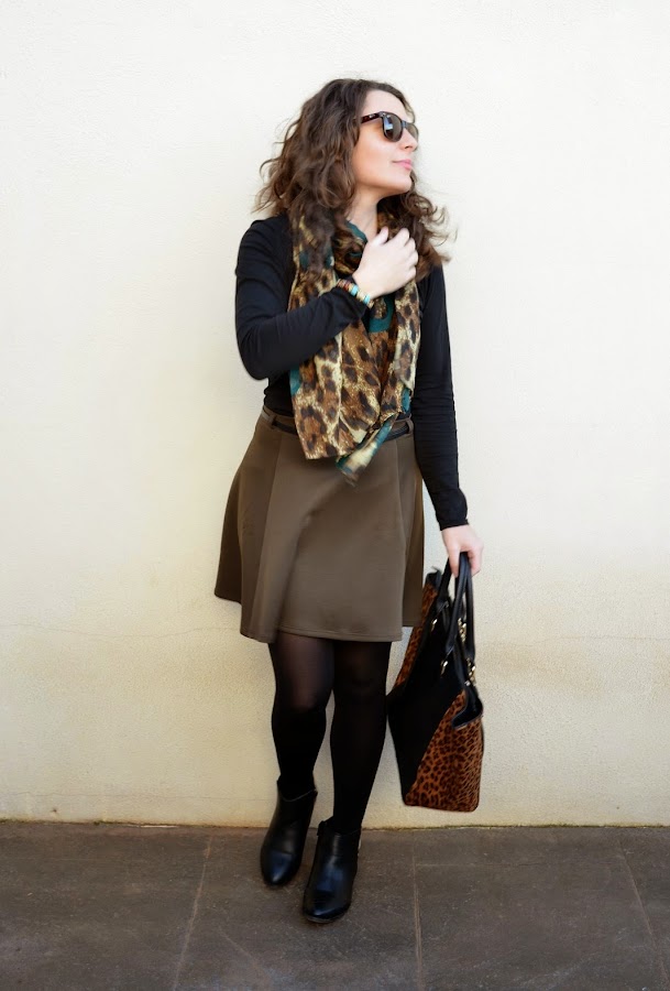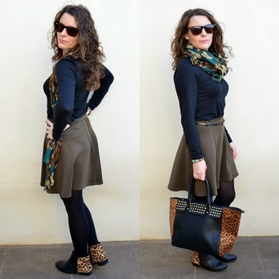 A principio del otoño muchos decían que el caqui era el nuevo negro, lo tachaban ya como la estrella de la temporada, aunque he de decir que creo que el burgundy le ha ganado terreno. A medias entre el color propio de los militares o el de un safari urbanita, se declaraba como un acierto seguro tanto para looks diarios como nocturnos. En el look de hoy la protagonista es la falda de neopreno en color caqui, sin duda una de mis mejores compras rebajiles. En este caso la he combinado con una camiseta básica en negro y con complementos en animal print que le dan mucho juego al outfit. Ya os digo que este no será el primer look en el que me veréis con esta falda, seguro que en primavera le saco mucho partido con una blusa o camiseta y con mi trench. ¿Qué opináis del verde caqui? ¿Os gusta?