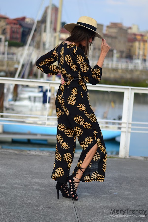 En concreto, para mis vacaciones de Semana Santa (el sábado me bajo 10 días a Benidorm, como todos los años), he optado por este mono de piñas sobre base negra de Shein, que me parece súper cómodo de cara a bajar a la playa, por ejemplo, en parte gracias a su tejido (muy fresquito) y su corte (holgado), con cinturilla elástica. Además, me encanta el escote tan pronunciado (que lo hace muuuy sexy) y las aberturas laterales en las perneras, que dejan ver el tacón. Y como tiene manguita larga, no necesito cargar con la chaqueta de turno por si refresca al caer la tarde.
