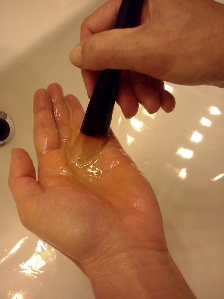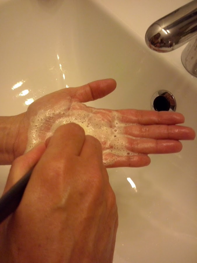Enjuagamos la palma de nuestra mano y repetimos esta operación un par de veces. A continuación enjuagamos nuestro pincel sin mojar el mango de madera.