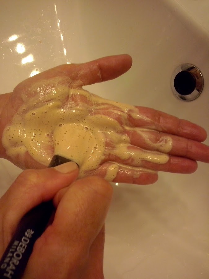 Es el momento de tratar nuestro pincel. Usamos para ello un champú suave. Si tenéis niños en casa, podéis usar un champú infantil... yo he usado un champú ecológico de eucalipto y argán, que también es muy suave.