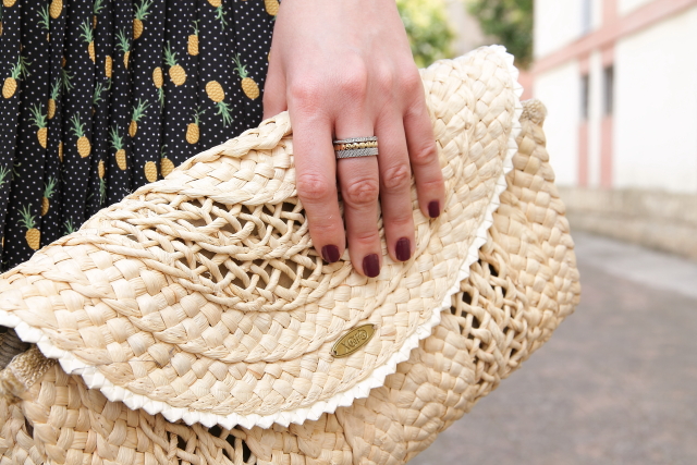 A principio de la temporada hice un post hablando del estampado de piñas, en él os conté que lo íbamos a ver muchísimo ya que iba a ser una de las tendencias de este verano. Pues bien hasta ahora no os había enseñado ninguno de mis looks con ellas. Esta falda fue un regalo de mi madre y la verdad que me encantó, el estampado de piñas y los topitos en blanco quedan muy finos y no se ve un print recargado como otras prendas que he visto. Combinada con blanco queda genial pero hoy me apetecía darle más vida al estampado, así que me he decantado por un top en el mismo color para hacerlas resaltar. En los pies mis nuevas cuñas, estoy encantada con ellas porque son muy cómodas, algo que siempre intento buscar.