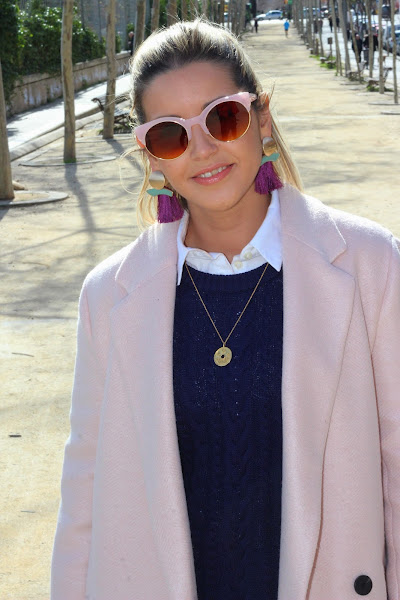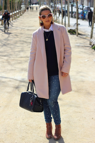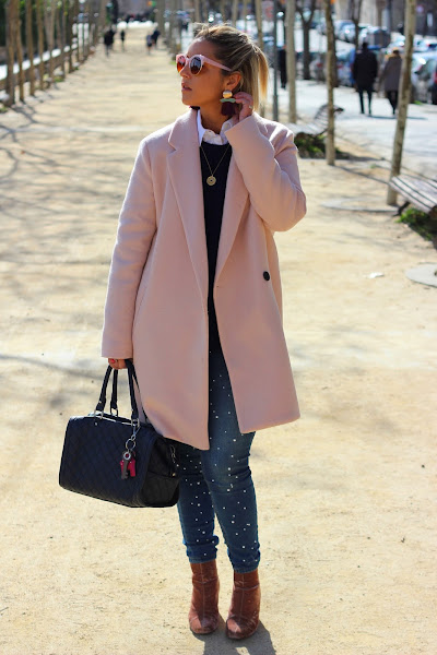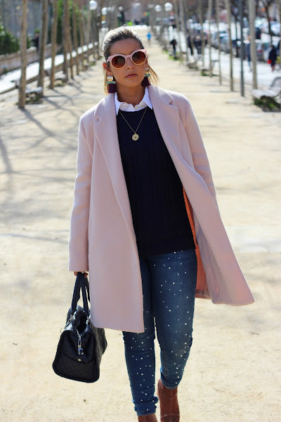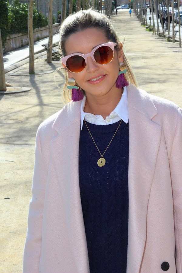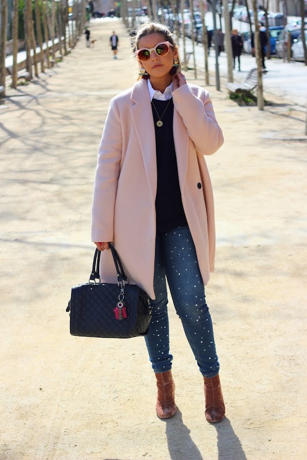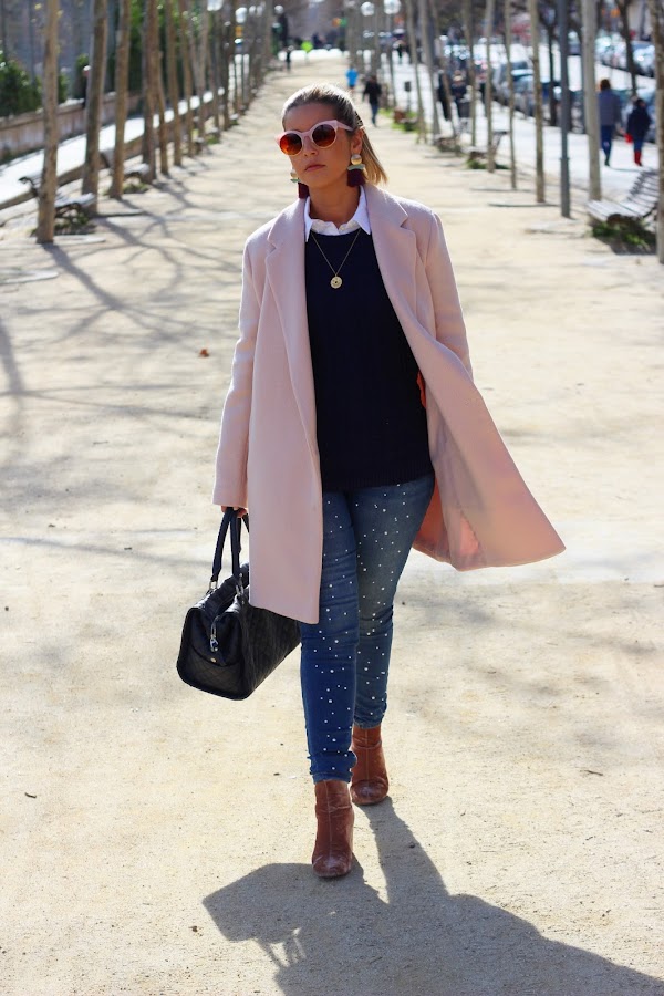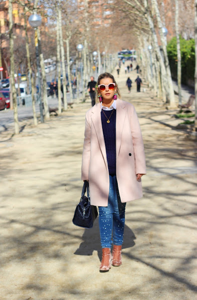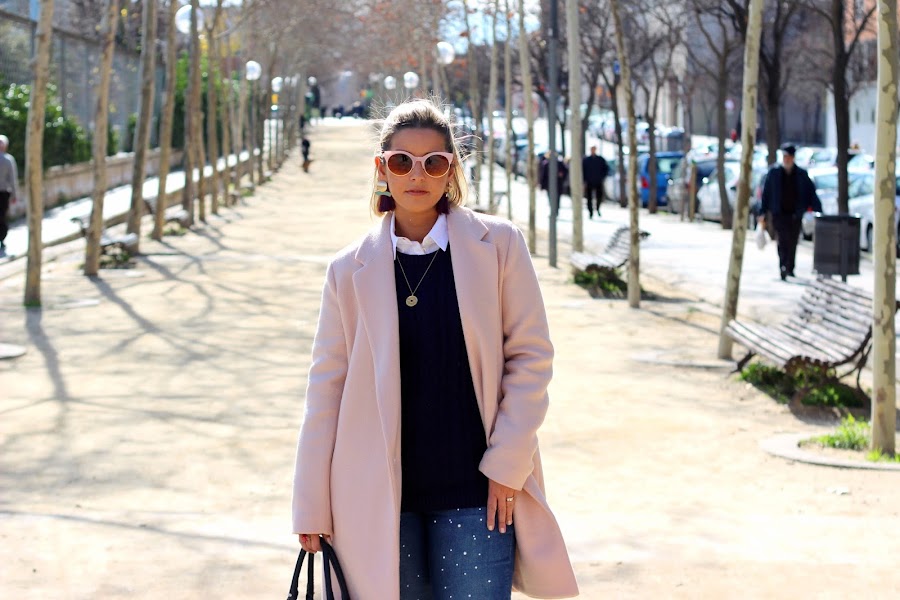En el look de hoy combiné mis jeans con perlas con una camisa blanca a la que añadí un jersey azul marino de punto y mi nuevo abrigo rosa de Zara, que llevaba buscando desde el año pasado y al fin lo encontré. El resto de accesorios fueron mis botines de terciopelo rosa, un bolso azul marino, mis maxi pendientes de flecos y mis gafas cat eye de color rosa. Un look clásico con pequeños detalles totalmente de moda que le dan un aire diferente al look.