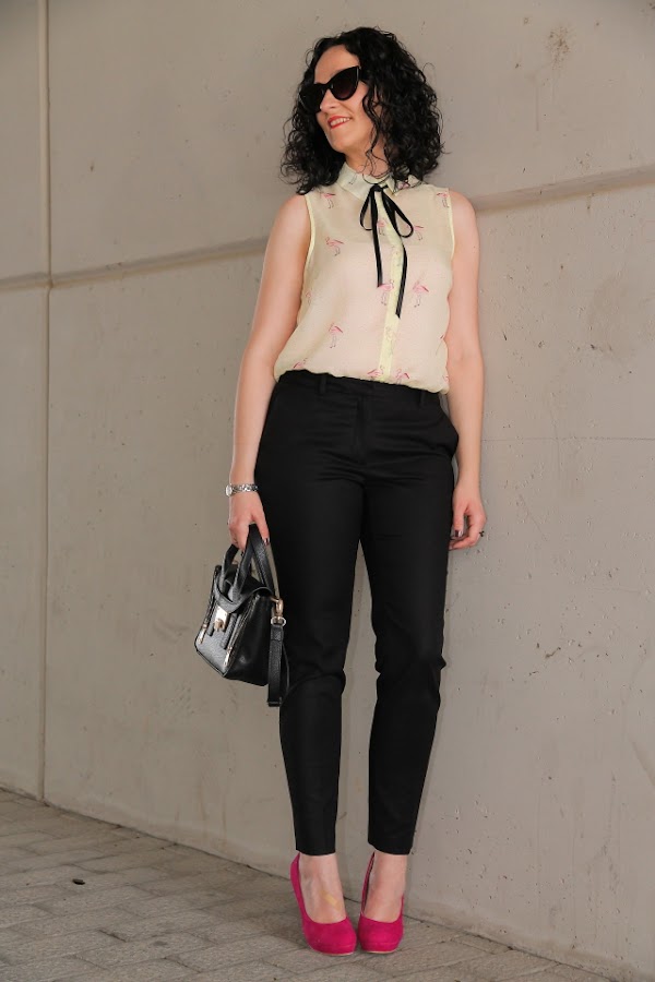 En los pies otra de mis piezas preferidas, unas sandalias atadas al tobillo con print de serpiente en un bonito color rosa-salmón que va muy acorde con el tono de mis dos flamencos.