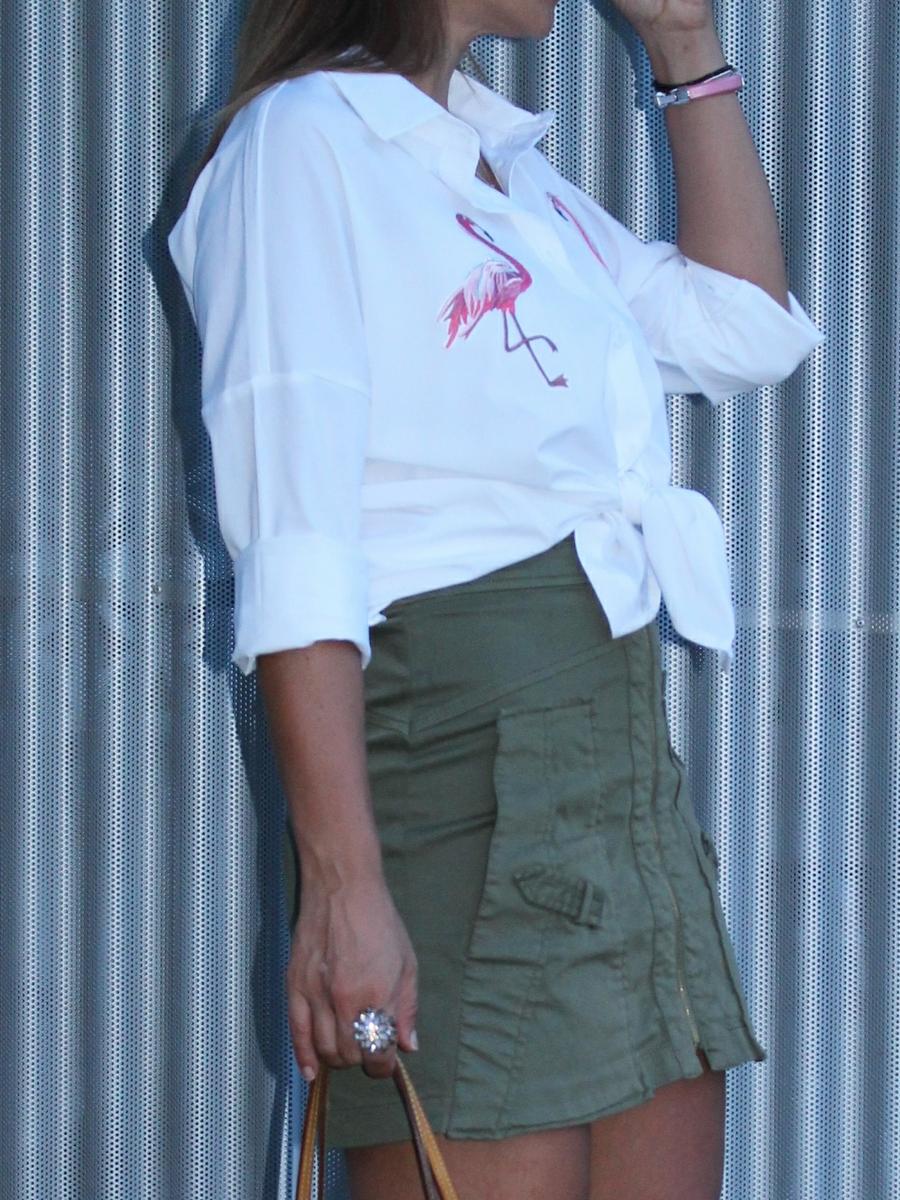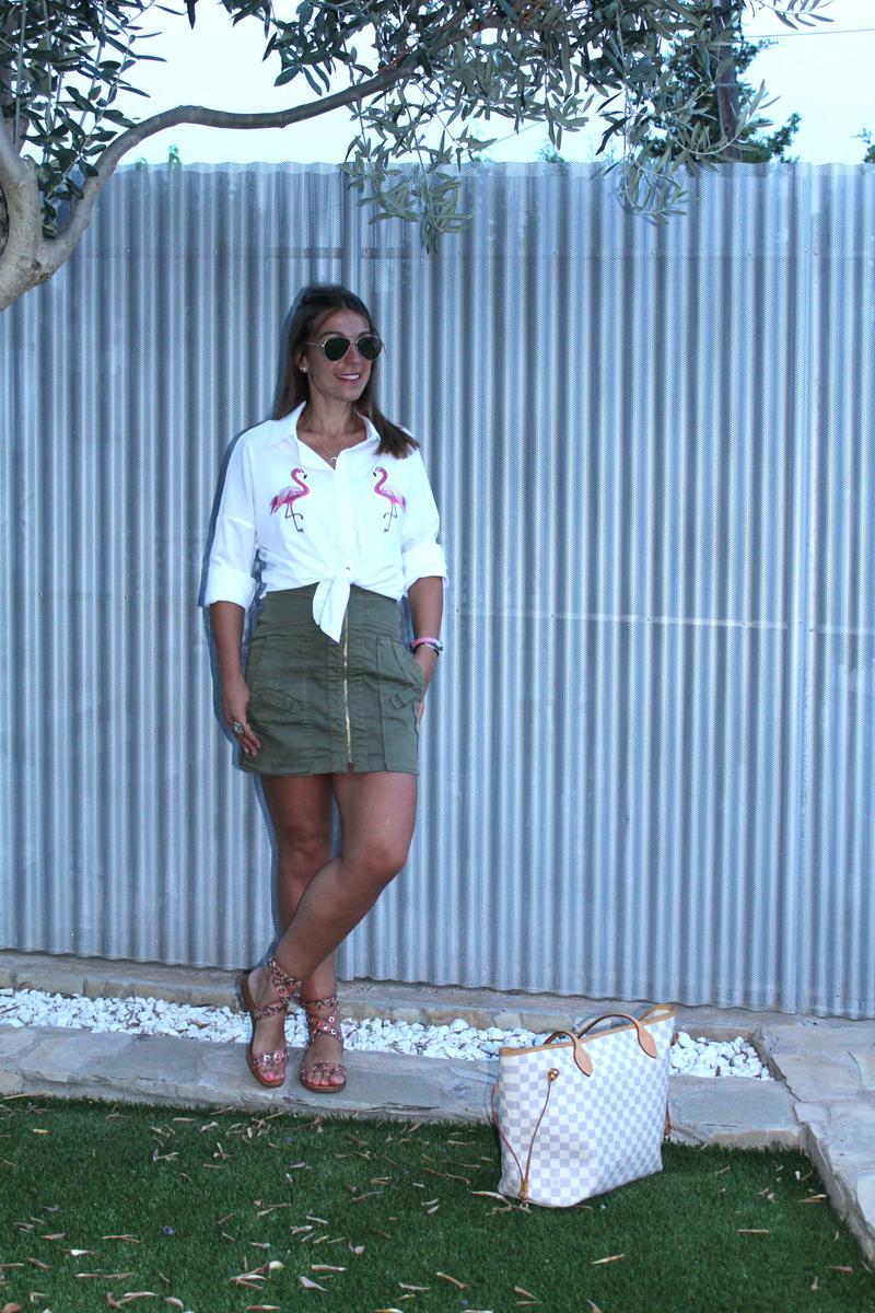 Aunque este tipo de estampados se relacionan más con la época veraniega, hay prendas que si no están sobrecargadas podremos usar también cuando las temperaturas ya no sean demasiado altas. Por esto mismo elegí la camisa de mi look de hoy, una camisa de manga larga de la marca SHEIN, adornada con dos bonitos flamencos en la parte delantera, muy versátil, ya que puedes jugar perfectamente con el largo de la camisa y de las mangas, en mi caso opté por anudarla a la cintura y remangar los brazos, ya que así consigo dos tendencias en una misma prenda, el nudo delantero y el print del verano. El resto del look una de mis faldas preferidas ( aunque ya tiene una par de años) tanto por el corte, por el color en verde militar, como por lo cómoda que es, la tengo bastante presente en mis looks.