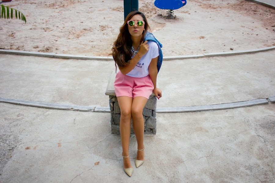 Siempre les hago mucho hincapié en que mezclen prendas y jueguen con ellas y es que es de mis partes favoritas al momento de armar looks ya que con pocas prendas puedes hacer muchísimos cambios y adaptarlos a diferentes actividades o eventos. En esta ocasión elegí como prenda principal unos shorts que dan la idea de ser una faldita, le sume una camiseta y una prenda de mezclilla para hacerlo muy relajado aún cuando estoy usando unos zapatos más formales.