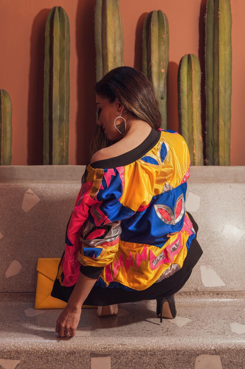 Every now and then I like to try crazier looks. I made this skirt a dress. I couldn’t decide which boot color so I mixed the two because they are the same height. Although the jacket has only a few touches of pink, the neon tone and super original design of the wrestling Mexican masks stands out and makes this outfit so interesting.