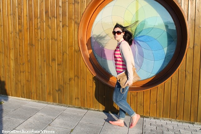 Llevo jeans con camisa de rayas rosa y topos y color nude, chaqueta nude, bolso del mismo tono y slippers moustache en rosa pastel